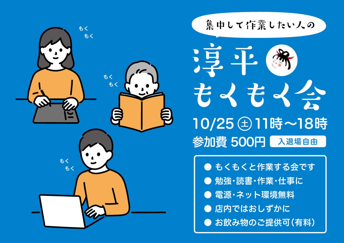 勉強・読書・作業・仕事など、店内で黙々とこなす会です。予約不要・入退場は自由で、電源やネット環境もお使いいただけます。お飲み物とスイーツのオーダーも承ります。